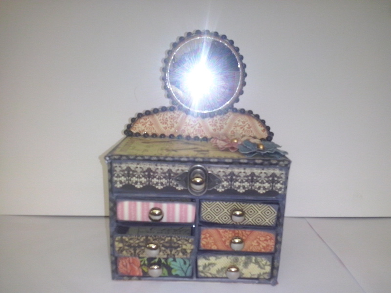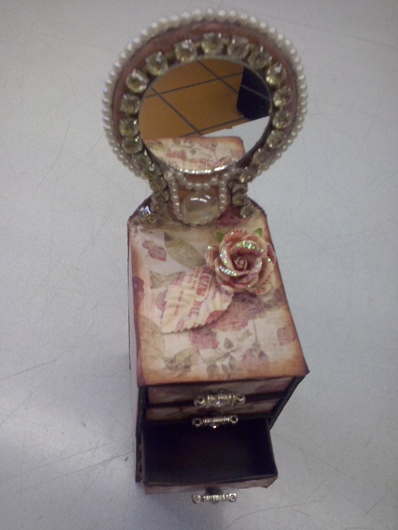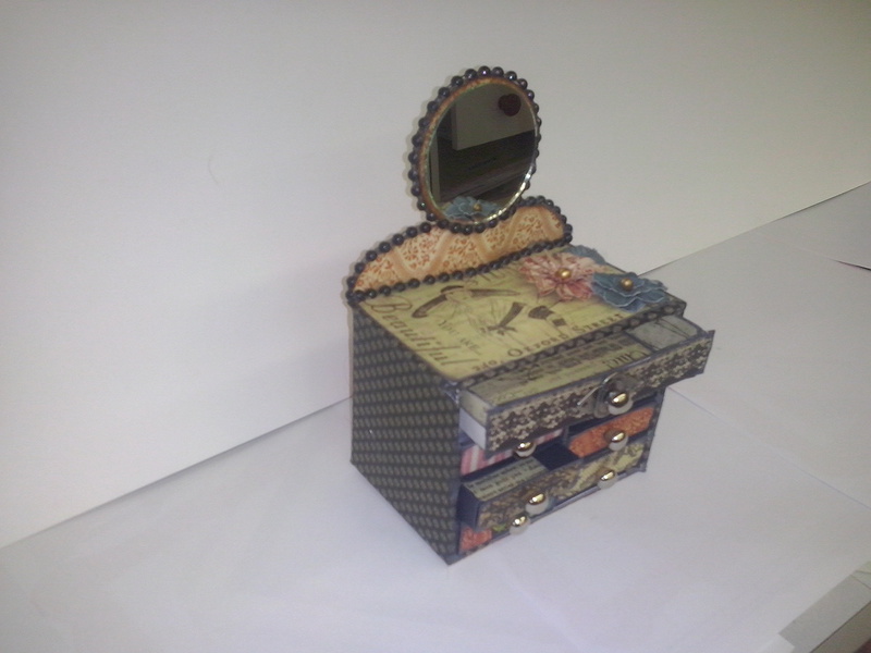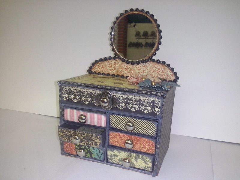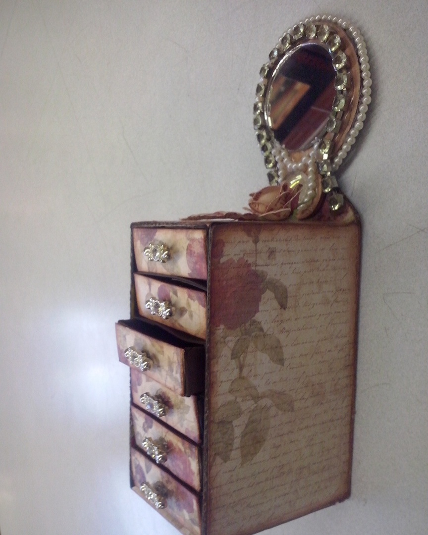 construida a partir de carton y de papeles de scrapbooking, compuesta por 6 cajoncitos pequeños laterales y uno de mediano central coronados por un espejo.