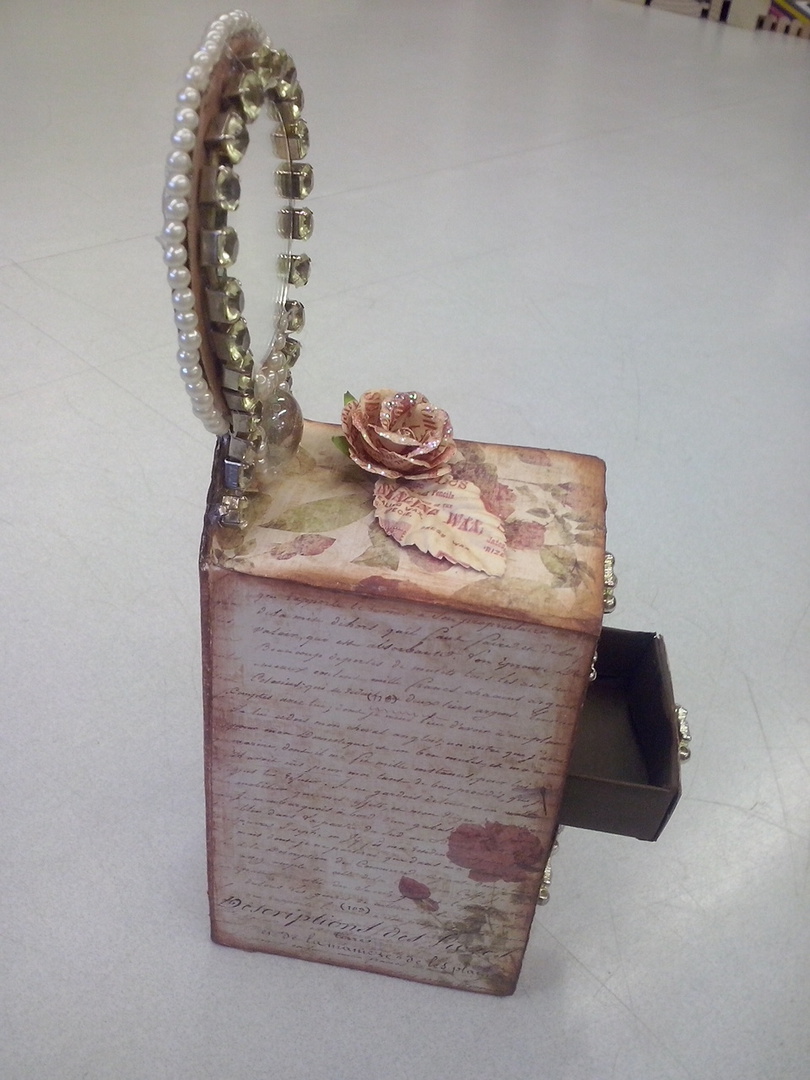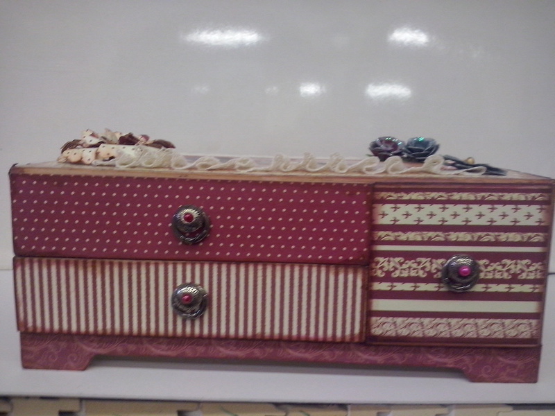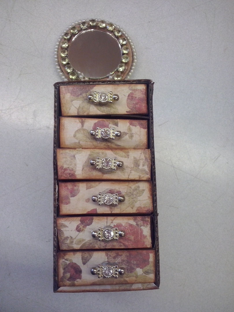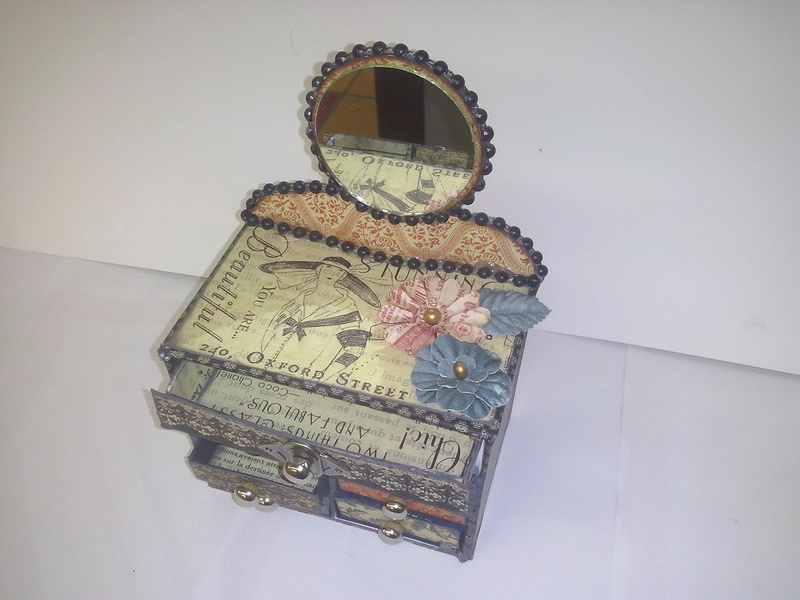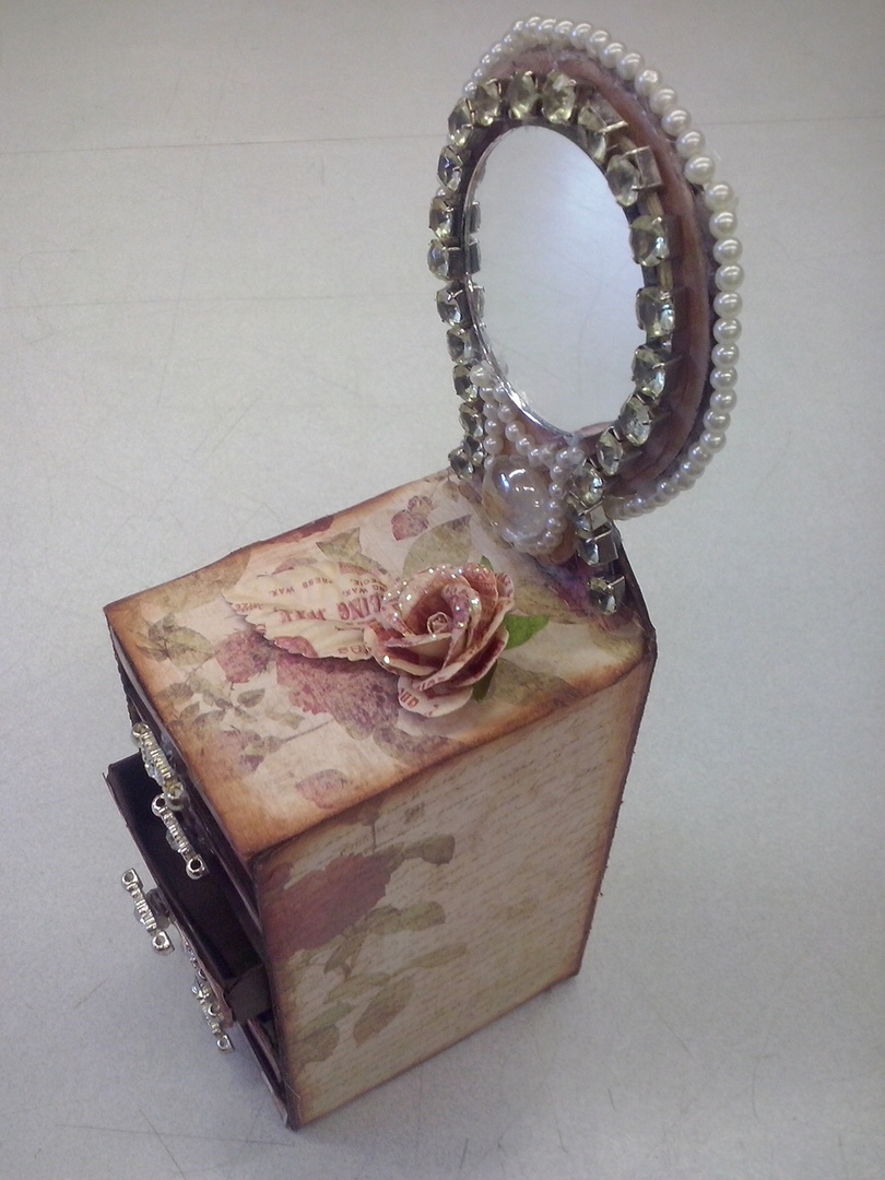 construida a partir de carton y de papeles de scrapbooking, compuesta por 6 cajoncitos pequeños laterales y uno de mediano central coronados por un espejo.